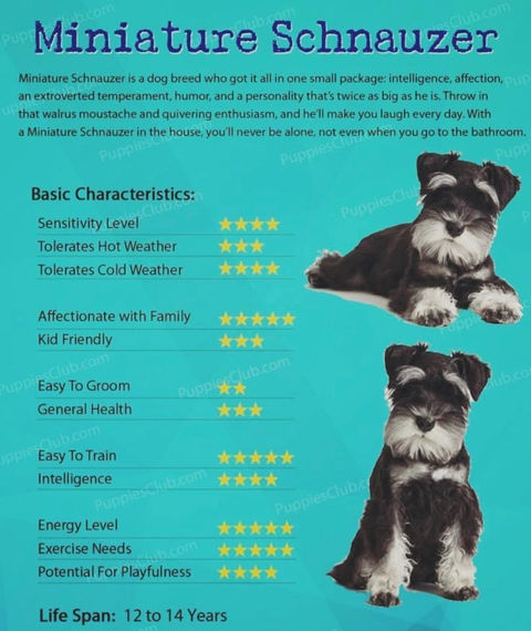Miniature Schnauzers live long and healthy lives when fed a high quality, vet recommended diet, and are provided proper medical attention, exercise and immunizations.